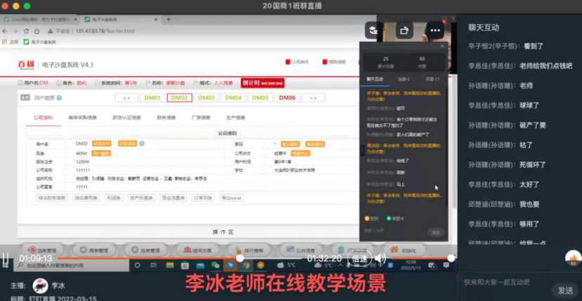 面对此次线上教学,教师直面挑战,迅速行动并结合以往线上授课经验,精心设计,大胆尝试,将“三教”改革落实到云端。李冰老师《沙盘对抗》课程通过沙盘模拟软件进行企业模拟经营,对学生进行分组,通过分组竞赛模式引导教学,以竞争竞赛方式激发学生学习兴趣,学生积极主动学习,参与性高,课上教师以企业案例组织学生实训实践,学生积极互动,通过这种以赛促学,以赛促练的模式,提高学生学习热情,同时掌握相关企业经营知识。
