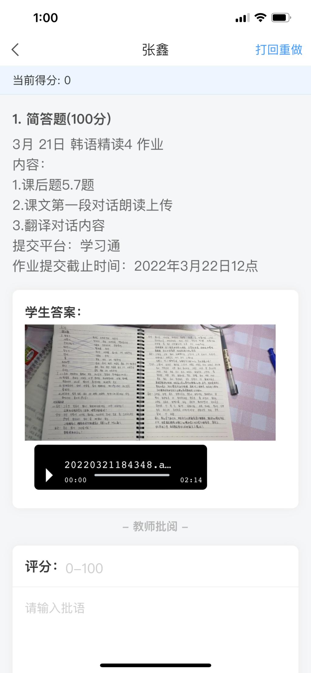 3.营造良好的学习气氛和学习风气。线上课通过多鼓励,多表扬来激发学生的上进心,使他们积极参与到课堂活动中来,通过说和练习题,设疑问答通过韩文录入在互动消息表达,培养学生的说、写和韩文输入的内容,通过在学习通上传朗读作业和词汇、语法作业来检查学生的课堂学习情况,课上进行讲解。听和说是交流的基本技能,也是促进读和写的重要途径和方法。