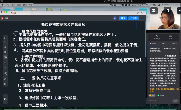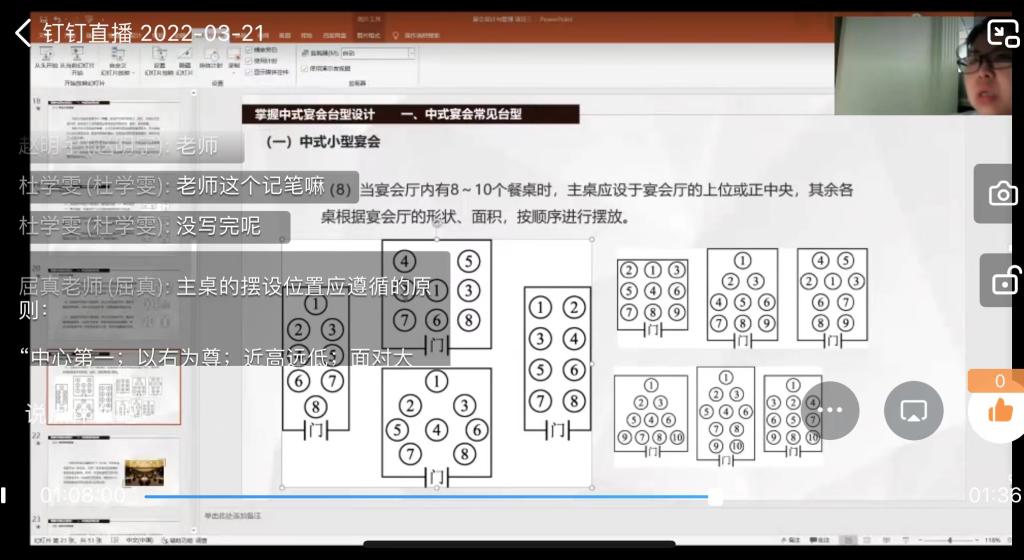 整个的教学实施过程中,通过活跃的课堂气氛,更好的激发了学生学习积极性,及时观察学生的听课情况,做到及时提问。由线下至线上教学中,线上教学无法及时监督学生的笔记情况,掌握的知识程度,观察学生学习表现和表情变化,所以在线上李安琪老师及时运用钉钉直播中连麦功能,有效判断学生的学习情况,利用讨论区的点赞、送花、表情及时对回答正确掌握知识情况好的同学予以表扬,激发学生之间的学习主动性。