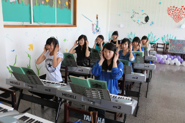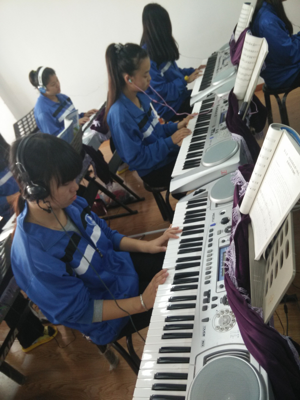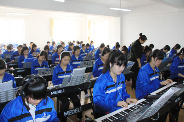 该实训室总面积80平方米,可容纳55人同时进行教学和实训,是学前教育专业进行琴法教学主要场所。该实训室有钢琴一台、电子琴55台、转换器55个、耳麦、电视一台。