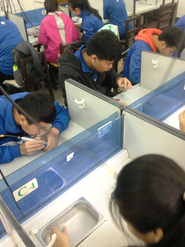 该实训室是主要承担《玉雕造型设计与加工》等课程的实习实训任务。实训室内配置吊机、加工机、实训工位及各类玉雕工具等设备。可同时容纳40人进行玉石切割、雕刻。