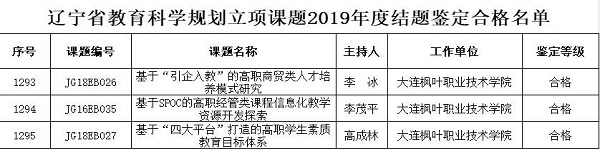 2019年10月,学院根据《辽宁省教育科学规划课题结题鉴定实施细则》的有关规定,组织开展2019年度辽宁省教育科学规划课题结题鉴定工作,经学院上报,省里专家论证,李冰老师主持的“基于“引企入教”的高职商贸类人才培养模式研究”、李茂平老师主持的“基于SPOC的高职经管类课程信息化教学资源开发探索”、高成林老师主持的“基于“四大平台”打造的高职学生素质教育目标体系”三项教育科学规划课题,同意结题。