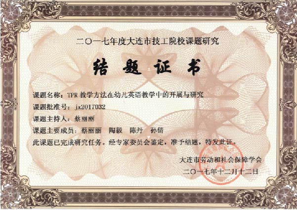 在2018年3月15日召开的“2018年职业教育和职业培训发展研究讲坛”中,大连市技工院校管理办公室的霍部长对2017年课题申报和课题研究成果进行了总结。我校2017年度共申报课题4项,均通过立项评审,其中陈莉莉老师的“关于提高国际贸易专业学生专业英语自主学习能力的研究”和蔡丽丽老师的“TPR教学方法在幼儿英语教学中的开展与研究”通过评审,顺利结题,结题通过率高于大连市技工院院校的平均通过率11个百分点,受到技工校领导们的一致好评。