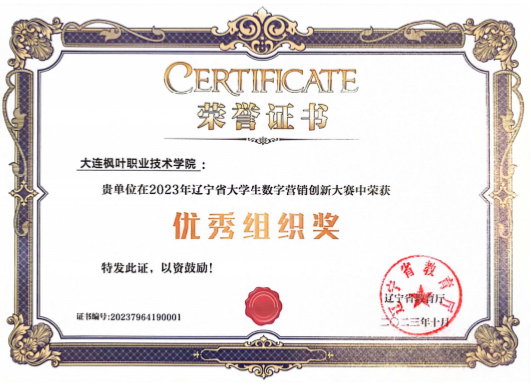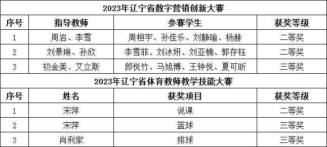 近日,辽宁省教育厅公布了2023年辽宁省数字营销创新大赛和2023年辽宁省体育教师教学技能大赛获奖名单,我院在两项比赛中均获“优秀组织奖”。财经商贸系师生在2023年辽宁省大学生数字营销创新大赛荣获二等奖2项、三等奖1项。马克思主义学院教师在2023年辽宁省体育教师教学技能大赛中荣获二等奖1项、三等奖2项。