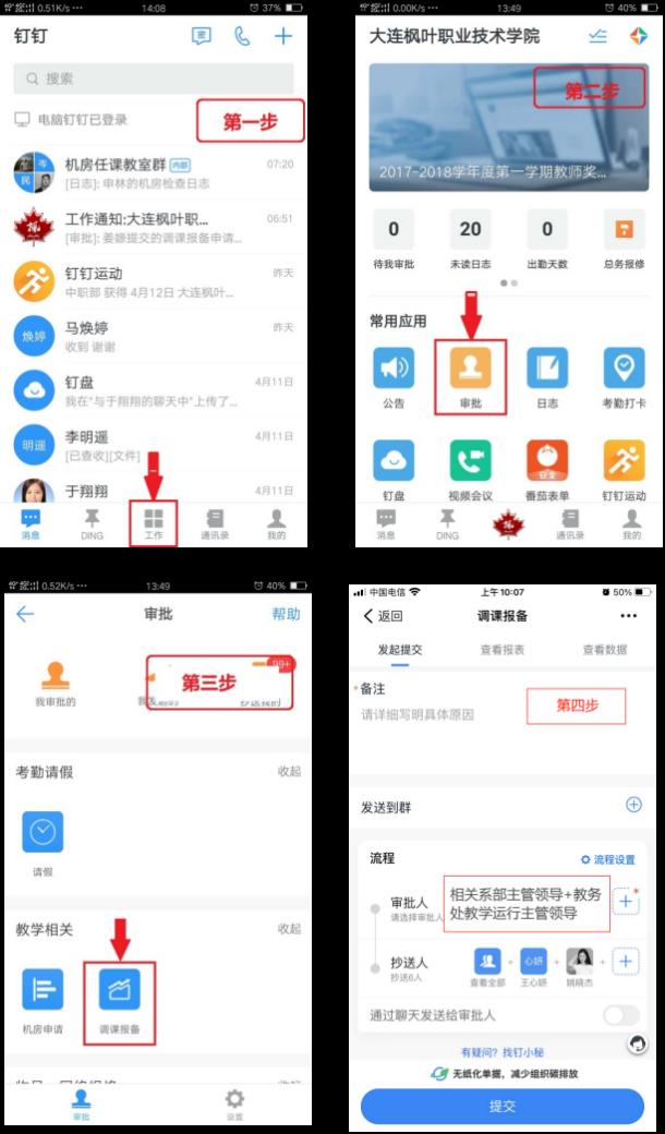 (1)任课教师办理调串课需提交提前在钉钉对应模块申请调串课,认真填写相关内容:班级、任课教师、填写日期、课程名称、调课原因、原上课时间及拟调整时间等,公出调课须出示相关报告、通知或书面申请,且附在钉钉备注上。兼职教师调串课,需提交纸质版调串课申请单(如不能亲自填写纸质版调串课申请单,则可以委托所属教学单位或团队老师代为办理),调串课申请单详见附件2。