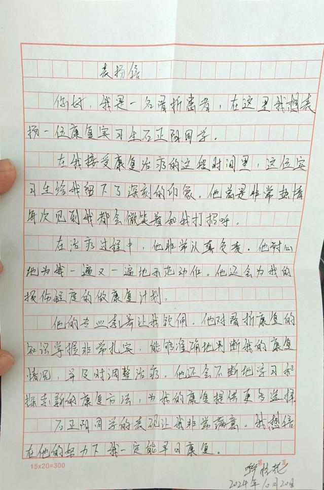 有一位因厂内工作操作失误手部骨折的患者,刚来的时候情绪低落,对康复失去信心。我和带教老师一起,为他制定康复计划,在每次治疗时都给予他鼓励和支持。经过一段时间的努力,他的手部功能逐渐恢复,脸上也露出了久违的笑容。他还送给了我一份表扬信,那一刻,我内心充满了成就感,也更加坚定了自己在康复领域的信念。
