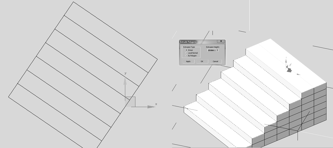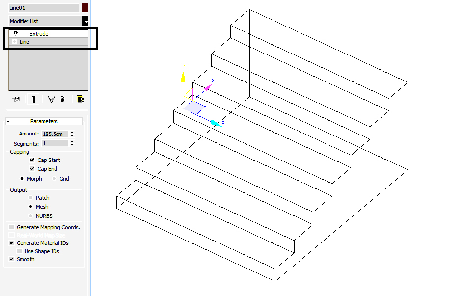 ⑴ 对于正方向(横平竖直)的台阶,制作非常简单,可以在侧视图画出剖面,然后使用挤出修改器,制作台阶的宽度。如图