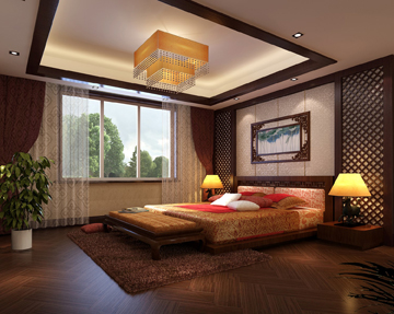 1、“文件”——“打开” “卧室”文件(这是一幅中式卧室效果图,除了筒灯的光晕效果没处理外,其他的都处理好了。接下来将运用photoshop中的相应工具为场景制作十字星光效果)