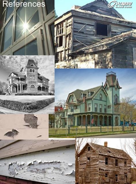 在纹理的第二层,我找到了一些木质纹理来制作窗户和窗台的部分,通过复制的方式可以增加贴图的面积,尤其注意在90边角的地方,需要使用笔刷和橡皮擦结合调整边缘的变形处理。这部分处理完毕后,我开始在第三层绘制污渍等具体部分的纹理。使用图层混合模式和不透明度的变化来调整,为了使木质纹理和污渍纹理更好的融合,我复制了底层的木纹放在所有图层的上方,将图层模式改为叠加,调整不透明度使其更加自然。为了使纹理更加完整,我再次新建了一层,使用带有不透明度的笔刷进行整体的气氛调整,尤其是边缘和墙壁的部分,最终的结果如下图。