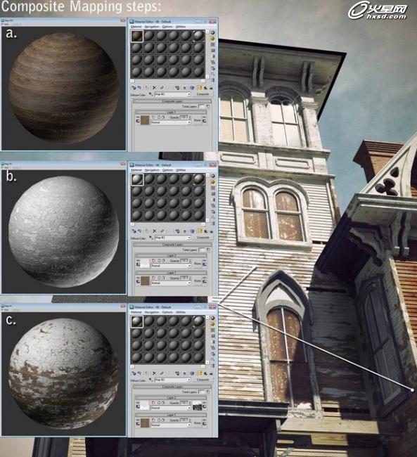 为了保证细节和高分辨率,我决定使用复合纹理来表现,贴图分辨率为2048*2048。渲染在中等面积大小的地方可以满足分辨率的要求,但在更大面积的地方就需要使用更加细致的纹理设置,使用复合贴图可以使你的纹理看起来更加真实,在多层中体现多层细节效果,这样比单纯在纹理中绘制层次要来的简单得多。