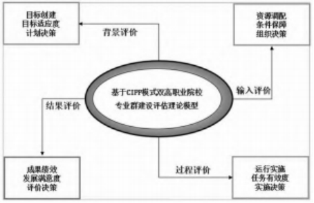 CIPP模式是基于决策导向的教育评价新模式,是理论与操作相结合的一种有效灵活的评价工具。其核心本质注重于评价对象的诊断与改进而非晋级证明评价对象的结果,是现代职业教育评价模式相对阐述全面,过程设计灵活严谨的有效评价模式。CIPP教育评价模式特征明显,具有高发展性、优改进性和强针对性等特点,是将理论思想和方法指导融合为一体的综合性评价模式。基于事物发展的四个不同阶段(背景、输入、过程、成果)对专业群建设进行分析评价,跟踪事物发展的全过程,各种缓解要素,根据专业群建设评价目的、评价内涵标准、评价主体内容等各方面构建出组织结构严谨、群内关系逻辑性强和操作性可行有效的专业群评价体系。